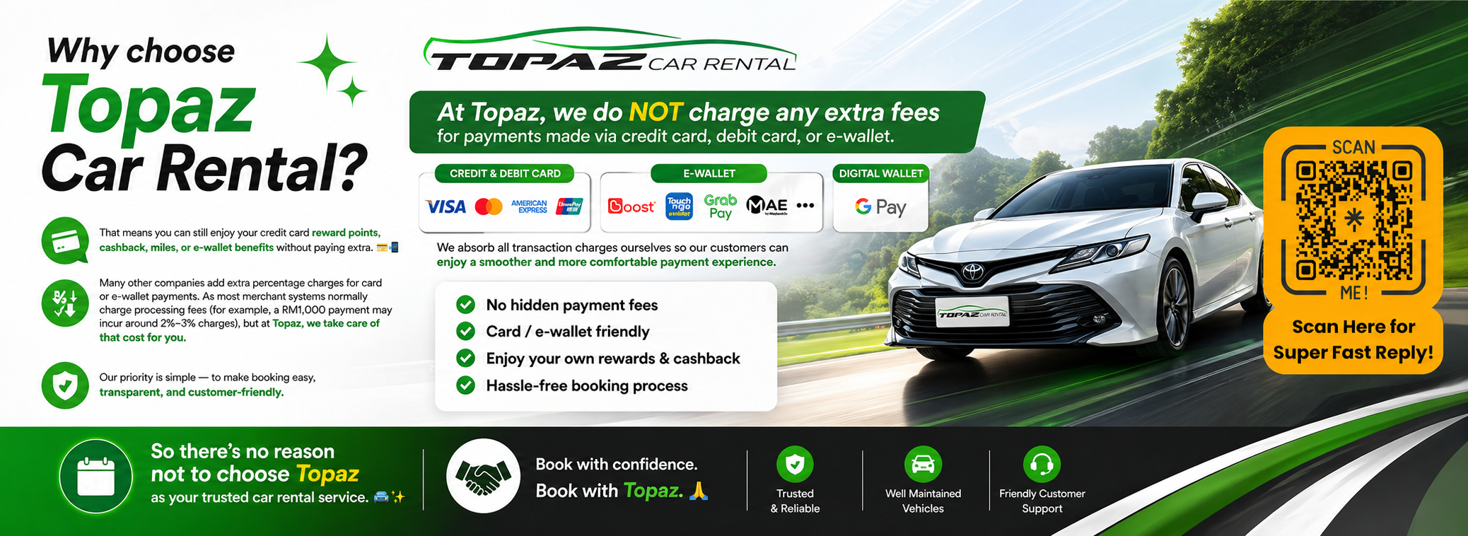 Car in good condition, staff is very responsive! Very pleasant experience of car renting experience with Topaz.